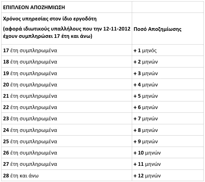 Όσοι εργαζόμενοι είχαν συμπληρώσει 17 έτη και άνω στον ίδιο εργοδότη έως τις 12 Νοεμβρίου 2012, δικαιούνται επιπλέον αποζημίωση.